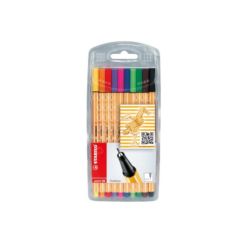 Astuccio 10 colori. Punta in feltro con rinforzo in metallo per garantire una grande resistenza. Cappuccio ventilato antisoffocamento. Lunga durata anche senza cappuccio. Ideale per lavori con riga , fotocopie e stancils. Tratto da 0,4mm.