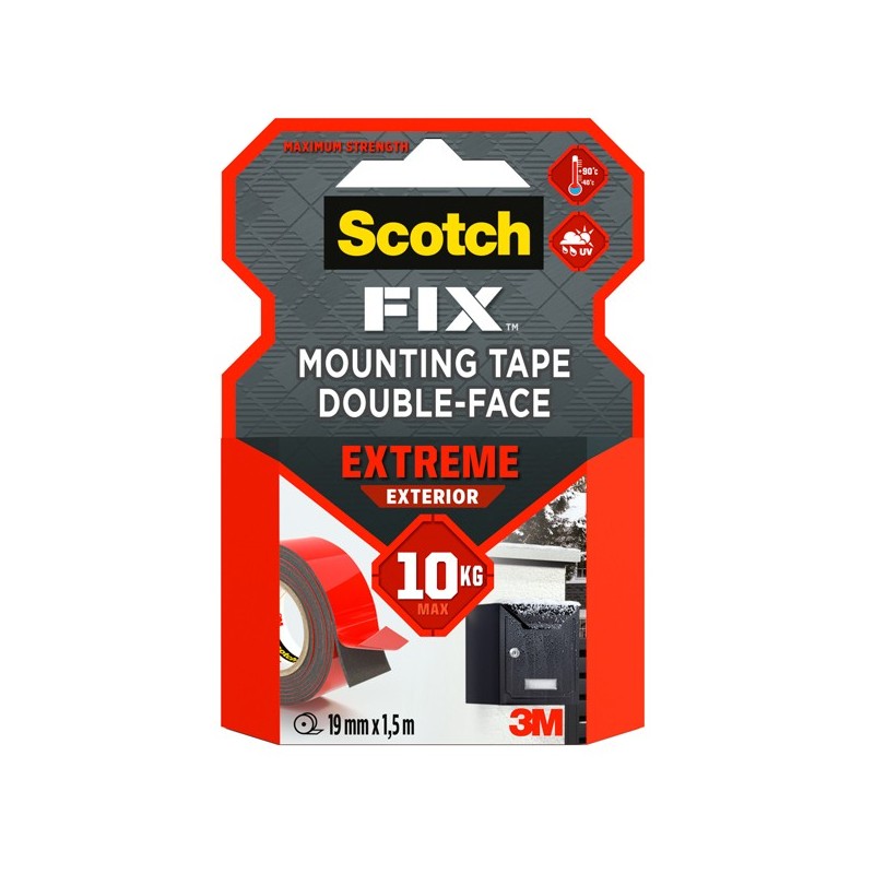 Scotch FIX™ Extreme Mounting Tape è un nastro biadesivo con adesivo a tecnologia avanzata progettato per il montaggio di oggetti su una varietà di superfici in condizioni estreme, fino a 13 kg. Questo prodotto è per uso interno ed esterno. Per ottenere le migliori prestazioni, conservare questo prodotto in condizioni normali di 21°C e 50% di umidità relativa nella confezione originale e utilizzarlo entro un anno dalla data di acquisto.