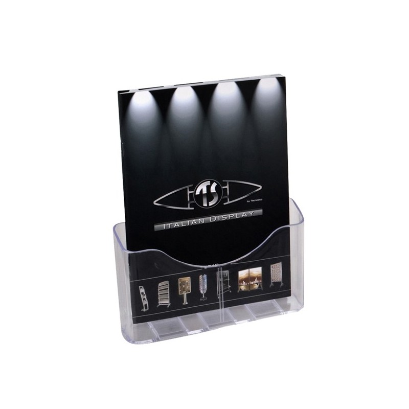 Portabrochure da banco in ps altamente trasparente. e' possibile appendere il portadeliant anche a parete grazie ai 2 fori posti sulla schieda che consentono la perfetta adesione alla parete stessa.