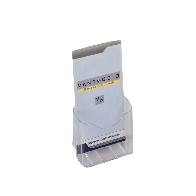 Espositore da banco portabrochure trasparente ad una tasca per formati 1/3 a4. Base 11cm profondita' 8,3cm altezza 19,8cm.