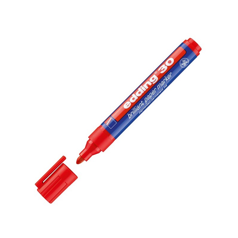 Marcatore indelebile brillante universale specialmente studiato per scrivere su carta e cartone, ma idoneo anche per scrivere su plastica, metallo e vetro. Inchiostro pigmentato a base d'acqua che non passa la carta. Punta tonda 1,5-3,0mm. Colore: rosso.