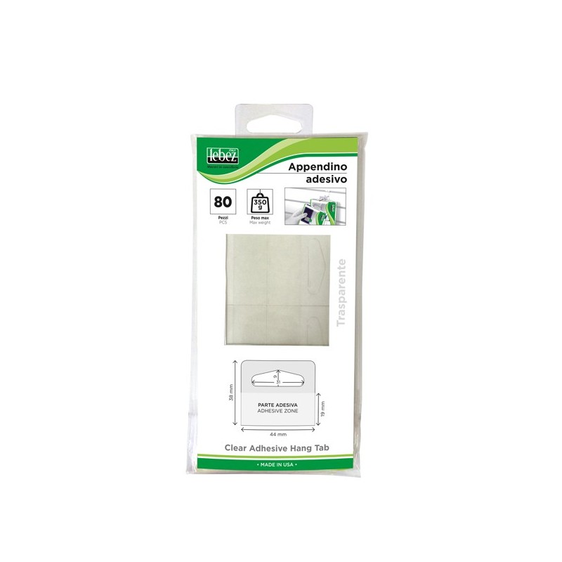Appendini adesivi trasparenti adatti a tutte le tipologie di ganci. Confezione da 80 pezzi, formato 4,5x4,5cm e tollerabilità massima 350gr.