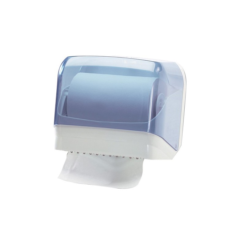 "Dispenser per asciugamani in carta. Puo' contenere sia il rotolo (dimensioni massime diametro 155mm h240mm) o i fogli intercalati piegati a ""C"" o a ""V"". Dimensioni dispenser: h251xp195xl300mm."