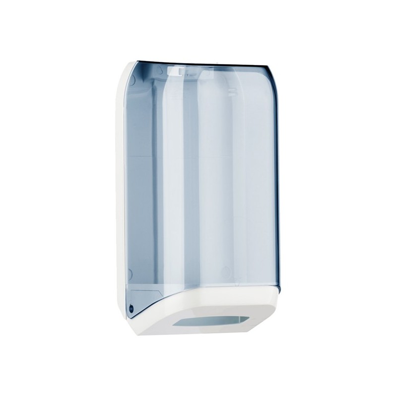 Dispenser murale per carta igienica in fogli interfogliati, capacità massima 500 foglietti. Dimensioni dispenser: 30,7x13,3x15,8cm, colore bianco/trasparente.