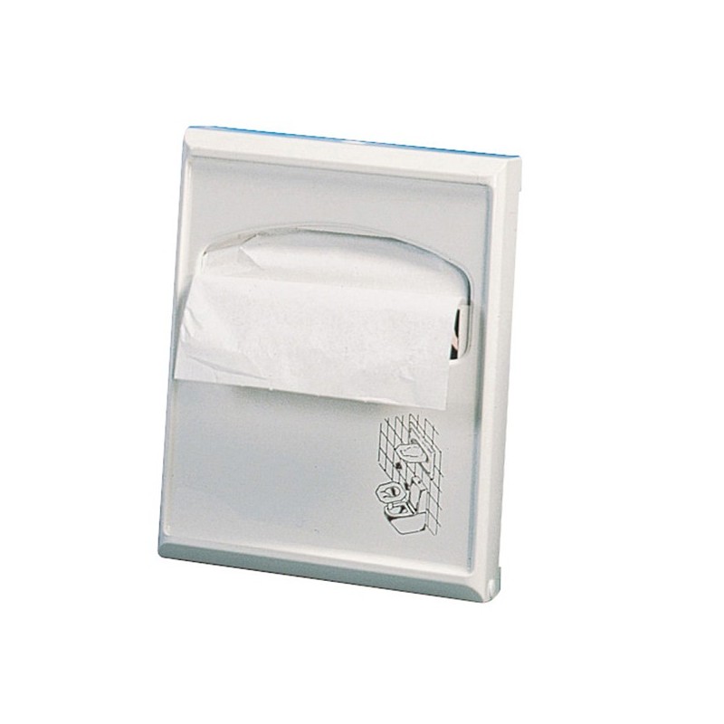 Dispenser murale per copri water bianco. Dimensioni: 29,5x5,5x23cm. Capacità 200 fogli piegati in 4.