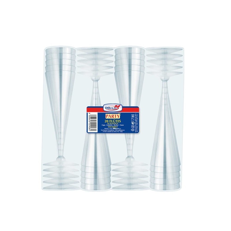 Flutes in plastica (polistirolo) trasparente. Riutilizzabili in lavastoviglie per 20 lavaggi.