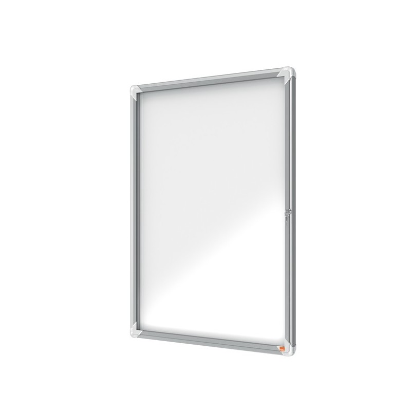 Ad anta battente. Moderna, sicura e resistente all'umidità. Nuovo design con robusta cornice in alluminio e vetro di sicurezza di 4mm. waterproof to iec 60529. Fondo in acciaio bianco magnetico per uso con magnetini o scrivibile con pennarelli a secco. Fissaggio semplice effettuabile da una sola persona. Serratura con 2 chiavi. f.to 9xa4: dim.est. 100x75,2x4,5cm