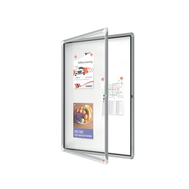 Ad anta battente. Nuovo design con robusta cornice in alluminio e vetro di sicurezza di 4mm. fondo in acciaio bianco magnetico per uso con magnetini o scrivibile con pennarelli a secco. Fissaggio semplice effettuabile da una sola persona. Serratura con 2 chiavi. apertura istallabile sia a destra che a sinistra. f.to 9xa4: dim.est. 1000x752x37mm