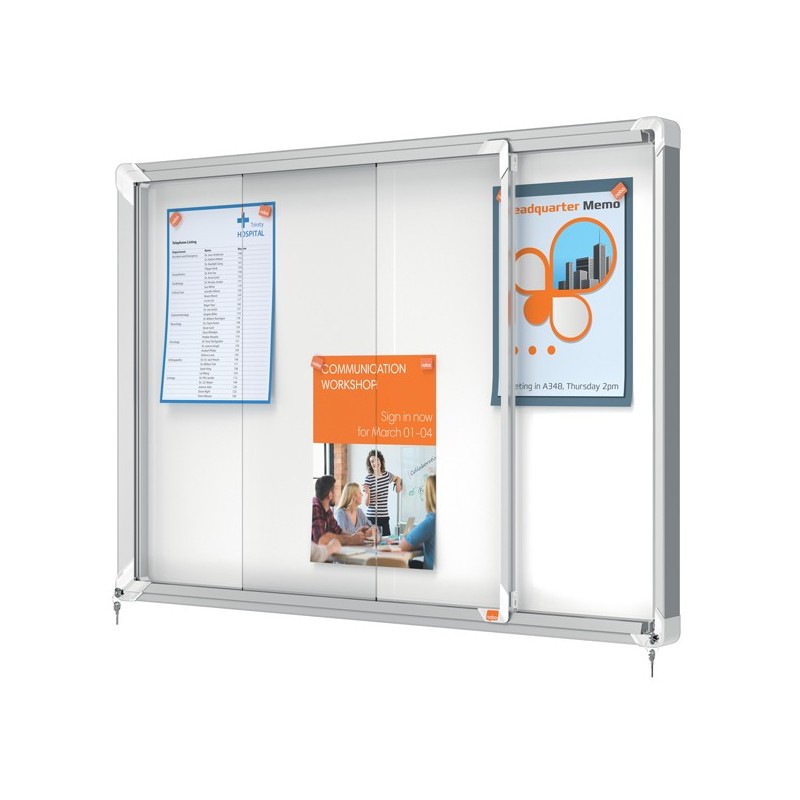 Ad ante scorrevoli. Nuovo design con robusta cornice in alluminio e vetro di sicurezza di 4mm. fondo fondo in acciaio bianco magnetico per uso con magnetini o scrivibile con pennarelli a secco. Fissaggio semplice effettuabile da una sola persona. Chiusura con doppia serratura. f.to 8xa4: dim.est. 692x972x54mm