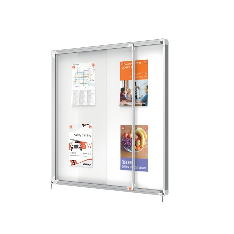 Ad ante scorrevoli. Nuovo design con robusta cornice in alluminio e vetro di sicurezza di 4mm. fondo fondo in acciaio bianco magnetico per uso con magnetini o scrivibile con pennarelli a secco. Fissaggio semplice effettuabile da una sola persona. Chiusura con doppia serratura. f.to 12xa4: dim.est. 1000x972x54mm