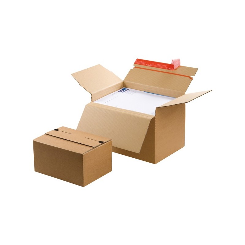 Scatola automontante con coperchio ad alette sovrapposte. Chiusura autoadesiva senza l'utilizzo di nastro adesivo o graffette. Altezza adattabile al contenuto grazie a delle scanalature da 130 a 220mm. Fondo doppio. Formato utile 304x216x130/220mm esterno 312x223x140/224.