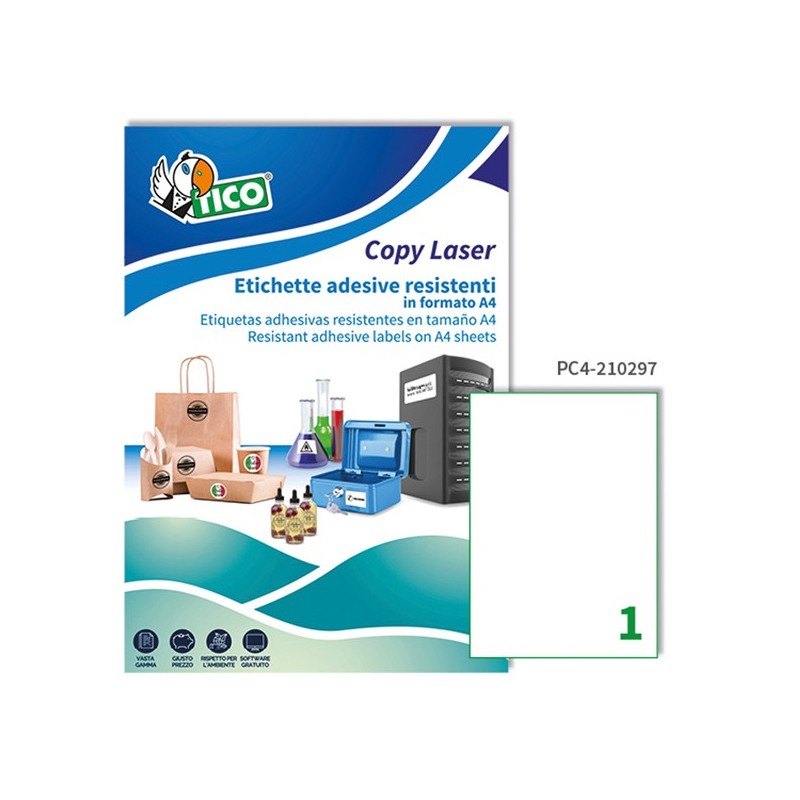 Etichette adesive PC4 - in poliestere - laser - permanenti - 210 x 297 mm - 1 et/fg - 100 fogli - trasparente - Tico