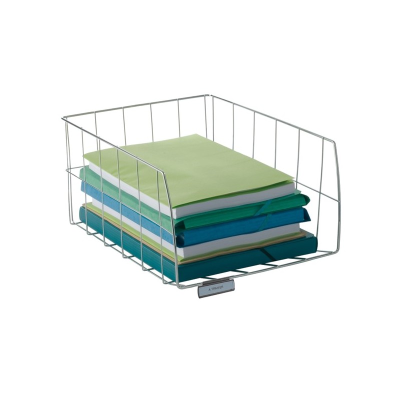 Vaschette portacorrispondenza alta capacità realizzate in robusta struttura in filo di metallo cromato e portaetichette in plastica per la personalizzazione del contenuto. Adatta a contenere documenti fino al formato 24x32cm. Dimensioni: 29x37cm - h 18cm.