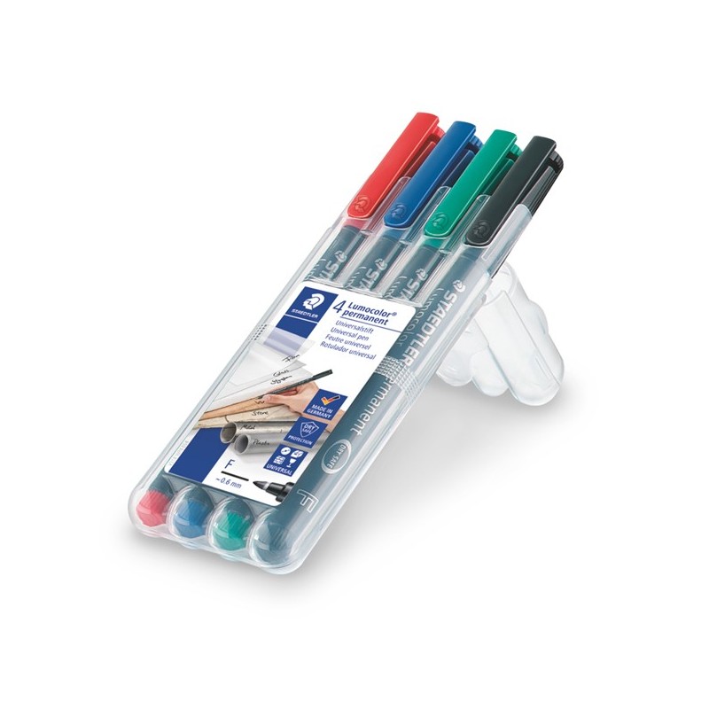 Busta 4 colori. Pennarello con inchiostro permanente a base d’alcool senza toluene e xylene. Quasi inodore. Tratto subito asciutto. Brevettato DrySafe (non secca se lasciato per alcuni giorni senza cappuccio). Ricaricabile con attivatori 487-17.