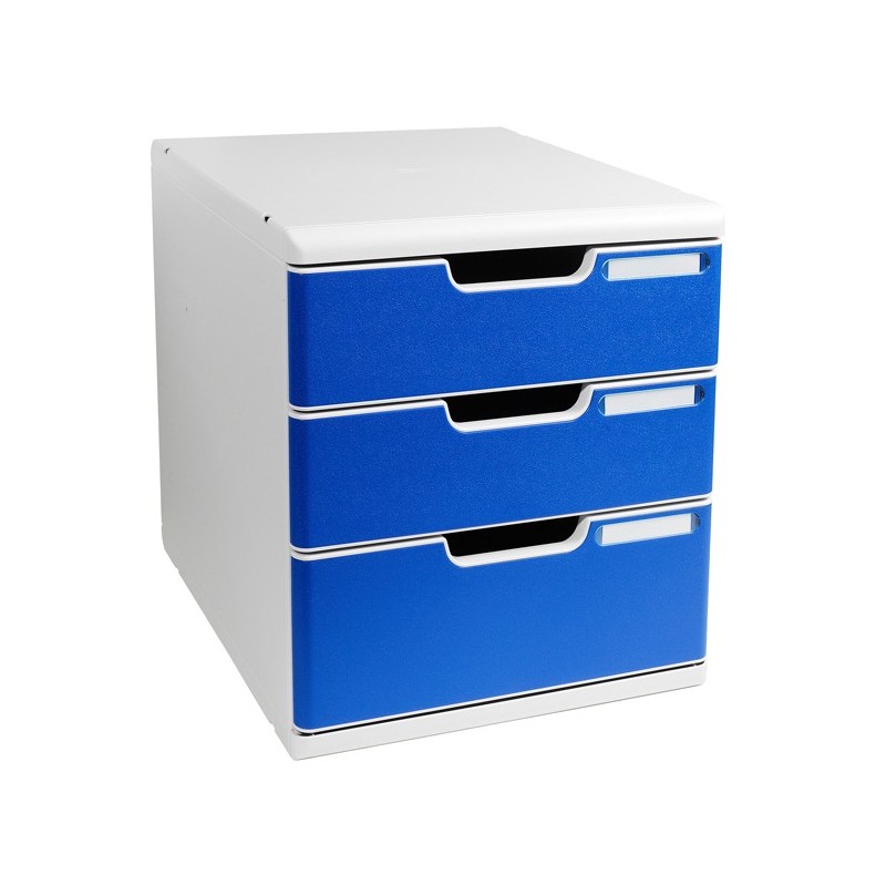 Modulo a 3 cassetti (2 da 8,2cm + 1 da 11cm) formato L 28,8x H 32x P 35cm. Sistema di archiviazione elegante e funzionale per l'archiviazione dei documenti formato a4+(24x33mm). I vari moduli a4 e a3 sono sovrapponibili ad incastro. Ogni modulo puo' variare come numero e altezza dei cassetti. Dotato di perfetto scorrimento dei cassetti con blocco d'arresto, pratica impugnatura e porta etichetta. Fornito con clip e tappini per l'assemblaggio