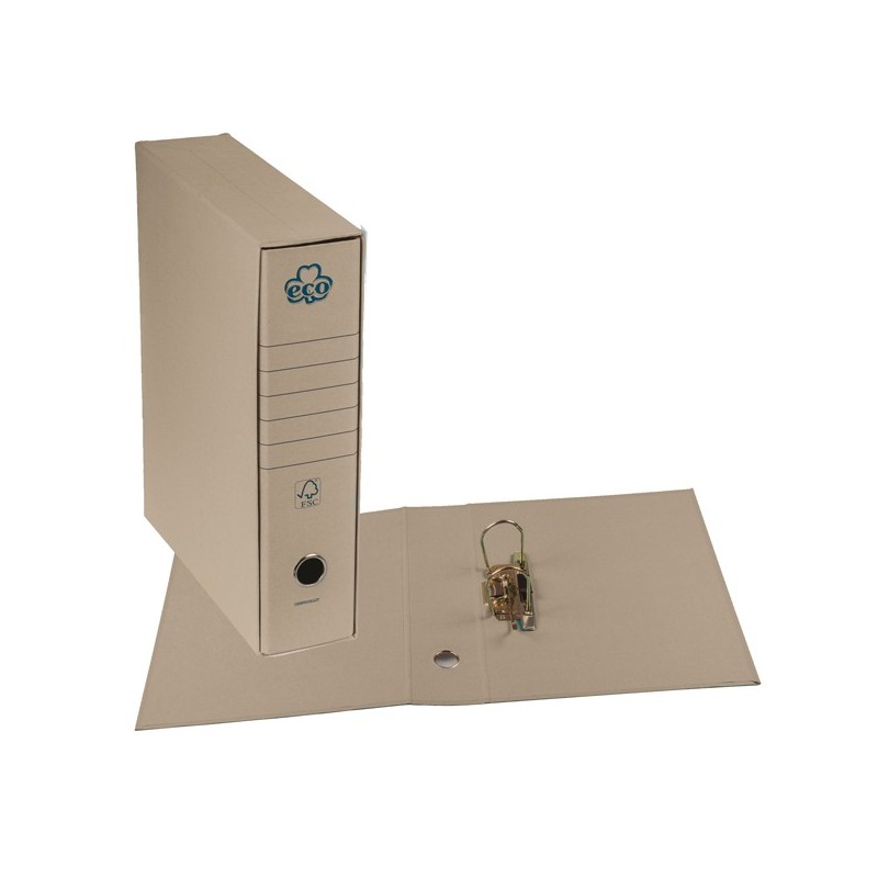 Registratori Eco con custodia (spessore 1,5 mm). Risguardo in carta riciclata tono su tono. Cartella e custodia rivestite con cartone riciclato tono su tono. Meccanismo interno a leva e pressino in metallo. Occhiello sul dorso per l'estrazione. Formato protocollo (LxH): 23x33 cm. Dorso 8 cm. Colore grigio. Dimensioni esterne: 35x28,5x8 cm. Prodotto certificato FSC.