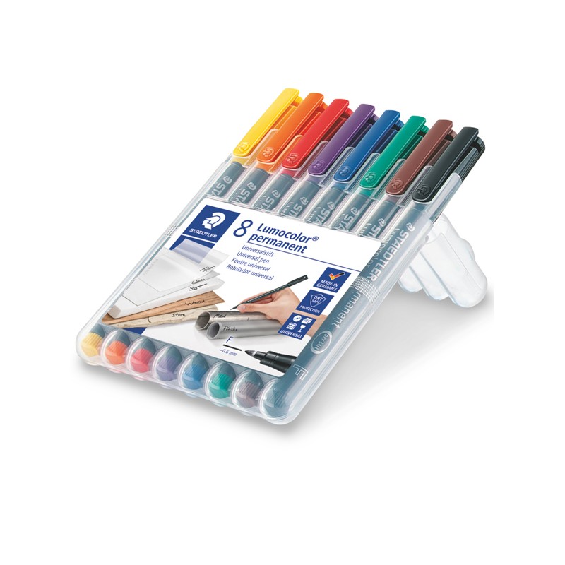 Busta 8 colori. Pennarello con inchiostro permanente a base d’alcool senza toluene e xylene. Quasi inodore. Tratto subito asciutto. Brevettato DrySafe (non secca se lasciato per alcuni giorni senza cappuccio). Ricaricabile con attivatori 487-17.