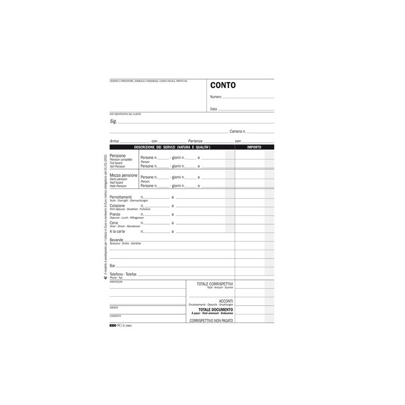BLOCCO CONTO ALBERGO / PENSIONE. Formato 23x15cm. 100fg. 7 giorni.
