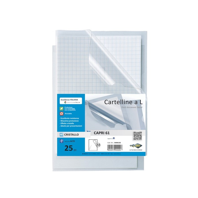 Cartelline Capri 61. Cartelline in PVC trasparente cristallo, alto spessore, con apertura a L e lunetta laterale per facilitare l'inserimento o l'estrazione. Ideali per raccogliere fogli e documenti. Non scivolano durante l'archiviazione. Formato esterno 232x322mm. Formato interno 210x297mm. Confezione da 25 cartelline trasparenti.