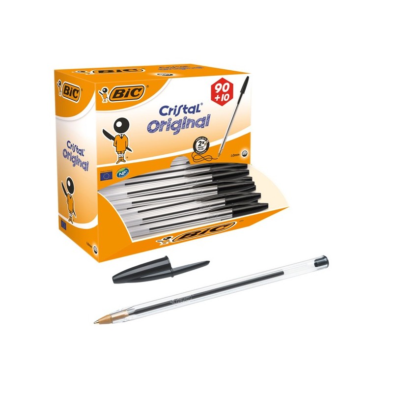 La penna CRISTAL fine con cappuccio e tappino del colore dell'inchiostro, fusto esagonale trasparente o traslucido per il controllo dell'inchiostro. Punta 1,0mm. Colore: nero. Confezione 90+10 pezzi.