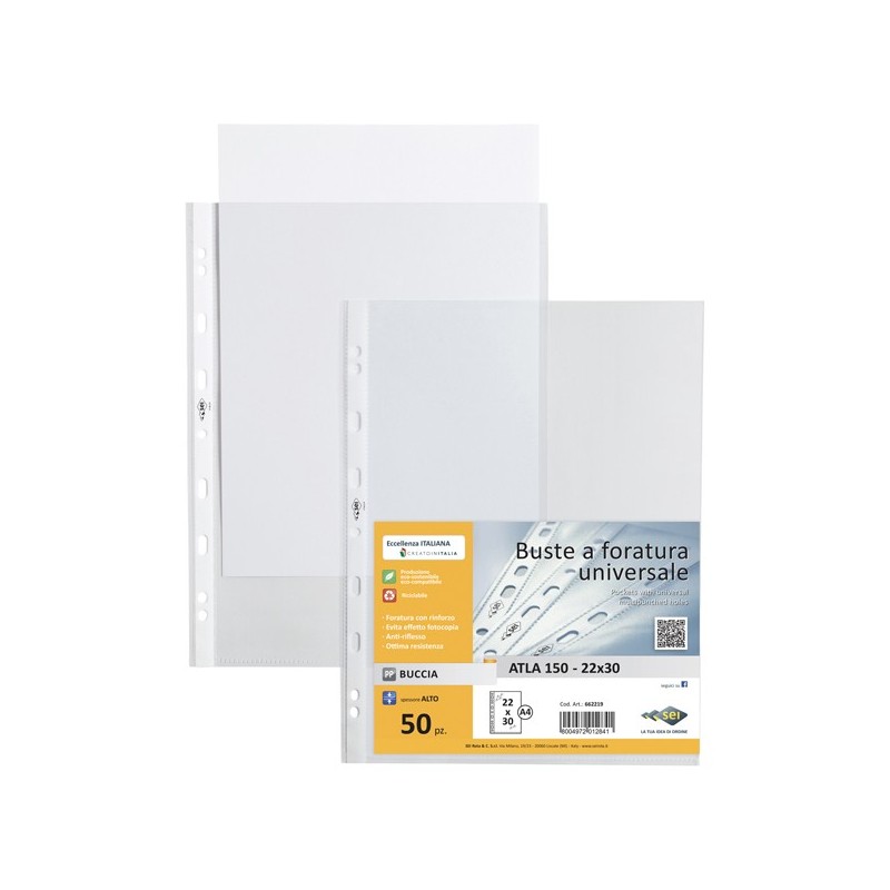 Buste forate in PP trasparente a buccia d'arancia con spessori alto. Foratura universale rinforzata. Ideali per archiviare qualsiasi tipo di documento. Formato utile 22x30 cm.