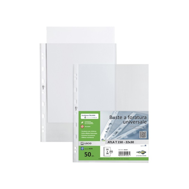 Buste forate in PP trasparente liscio con alto spessore. Foratura universale rinforzata. Ideali per archiviare qualsiasi tipo di documento. formato utile 22x30cm.