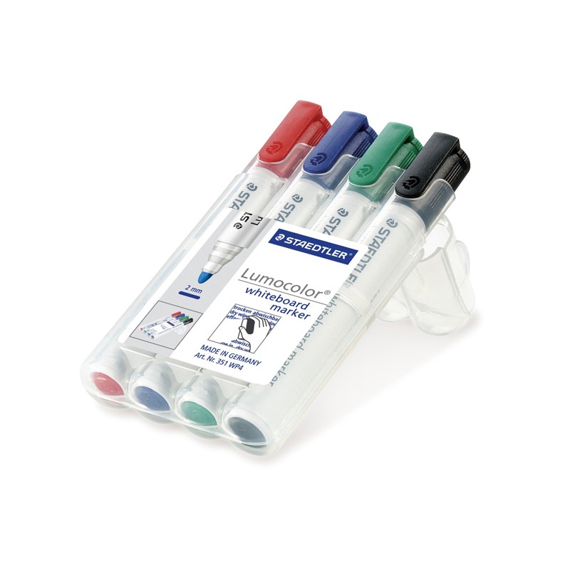 Busta 4 colori. LUMOCOLOR WHITEBOARD 351. Marcatore a base d’alcool cancellabile per lavagne bianche, vetro e porcellana. Inchiostro Dry Safe: lunga durata anche senza cappuccio. Con clip. Airplane safe. Punta sintetica tonda da 2mm.