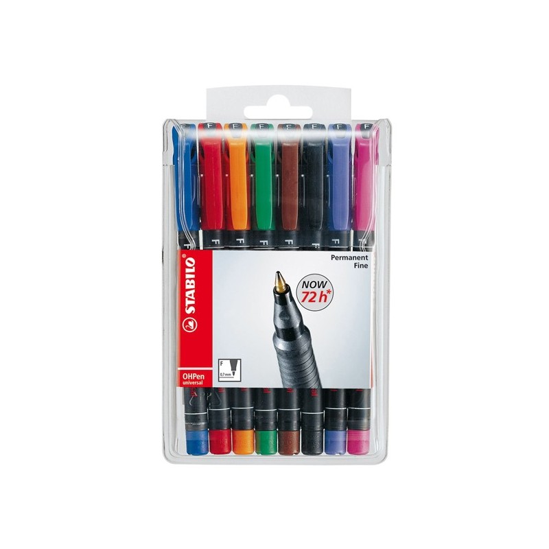 Busta 8 colori. Pennarello indelebile con punta in fibra per superfici lisce, lucidi, CD-DVD. Può rimanere senza cappuccio fino a tre giorni senza seccare. Punta 0,7mm.