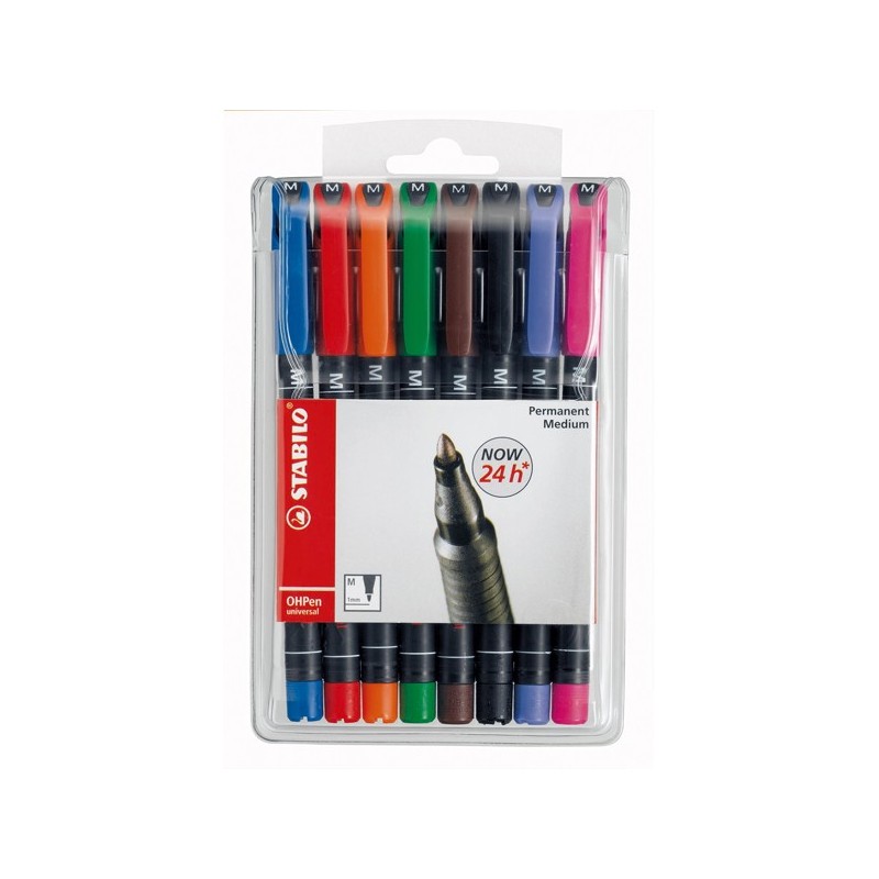 Busta 8 colori. Pennarello indelebile con punta in fibra per superfici lisce, lucidi, CD-DVD. Può rimanere senza cappuccio fino a tre giorni senza seccare. Punta 1,0mm.