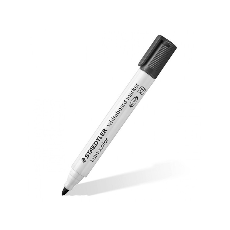 LUMOCOLOR WHITEBOARD 351. Marcatore a base d’alcool cancellabile per lavagne bianche, vetro e porcellana. Inchiostro Dry Safe: lunga durata anche senza cappuccio. Con clip. Airplane safe. Punta sintetica tonda da 2mm. Colore: nero.