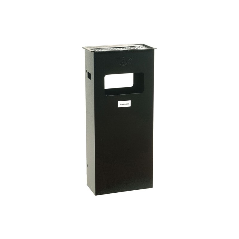Posacenere e gettacarta con cestello superiore estraibile con griglia in acciaio inossidabile. Parte inferiore per la raccolta della carta. Struttura in lamiera verniciata a polvere epossidica adatta per l'ambiente esterno. Dimensione: 30x70x15cm. Sacchetti compatibili: 50x60cm (30 litri) e 55x65cm (50 litri).