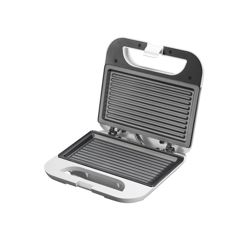 Tostiera e mini bistecchiera con piastre grill antiaderenti, per una facile pulizia. Pareti fredde. Maniglia e corpo termoisolati. Chiusura di sicurezza. Spie led di accensione e funzionamento. Piedini antiscivolo. Termostato. Alimentazione: 220-240V ~ 50Hz. Potenza: 750 W. Dimensioni piastra 13x23cm - Dimensione totale 23x22x8cm.