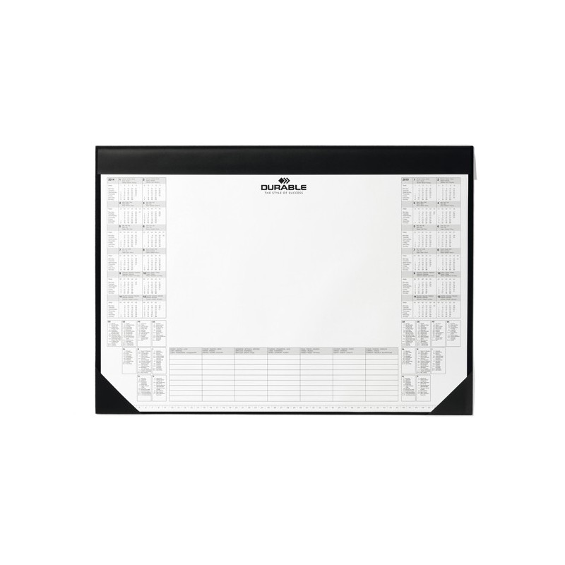 Sottomano rettangolare dotato di 25 fogli con calendario biannuale multilingue, festività nazionali e sezione settimanale utile per appunti. Dimensioni 59x42cm, di colore nero.