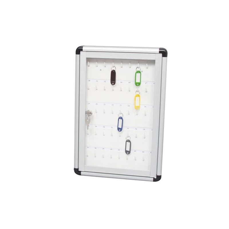 BACHECA MURALE CON PANNELLO IN ACCIAIO LACCATO E GANCI NUMERATI. STRUTTURA IN ALLUMINIO ANODIZZATO. ANTA BATTENTE IN ACRILICO CON SERRATURA. Le file dei ganci distano fra loro (sopra e sotto) di 6,3cm. DIMENSIONI (BXH): 30X45CM - 45 POSTI CHIAVE