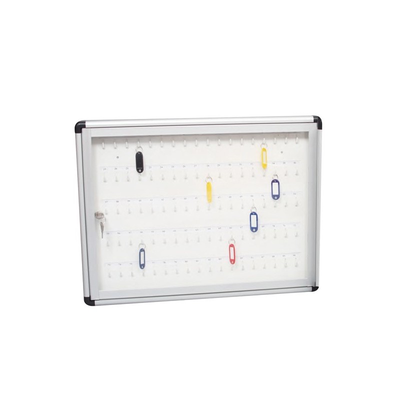 BACHECA MURALE CON PANNELLO IN ACCIAIO LACCATO E GANCI NUMERATI. STRUTTURA IN ALLUMINIO ANODIZZATO. ANTA BATTENTE IN ACRILICO CON SERRATURA. Le file dei ganci distano fra loro (sopra e sotto) di 6,3cm. DIMENSIONI (HXBXP): 45X60X4,5CM - 90 POSTI CHIAVE