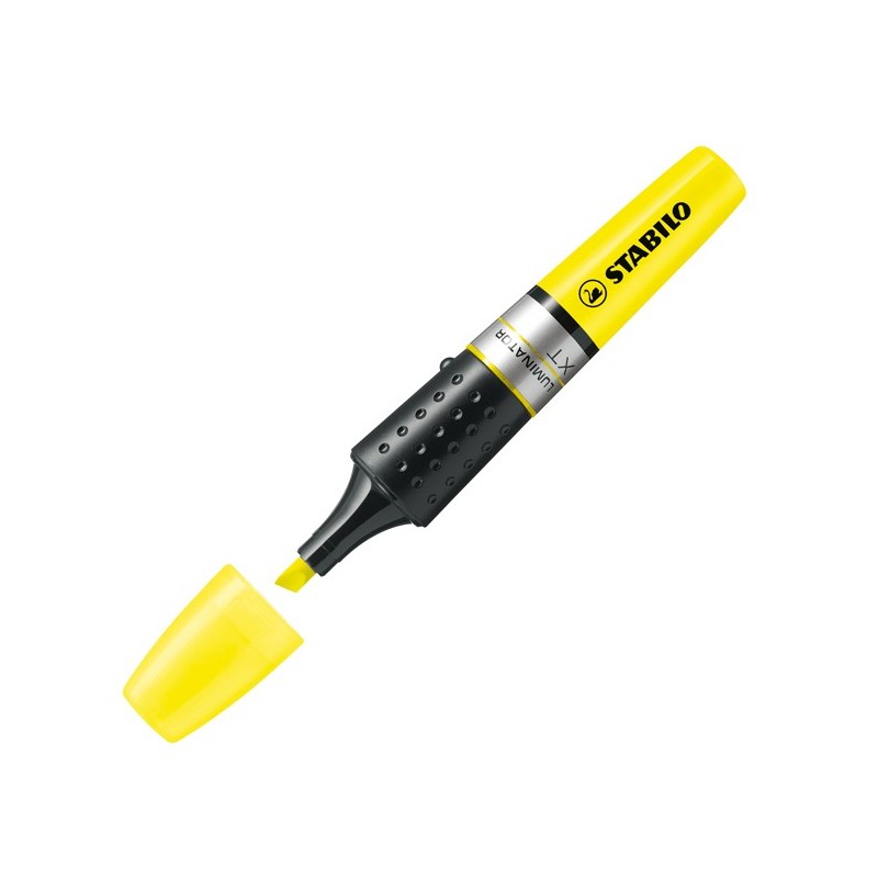 Inchiostro a base d'acqua. Serbatoio a vista XXL con indicatore d'inchiostro. Evidenzia fino a 500mt. Resiste 4 ore senza cappuccio. Due ampiezze di tratto 2-5mm. Colore: giallo.