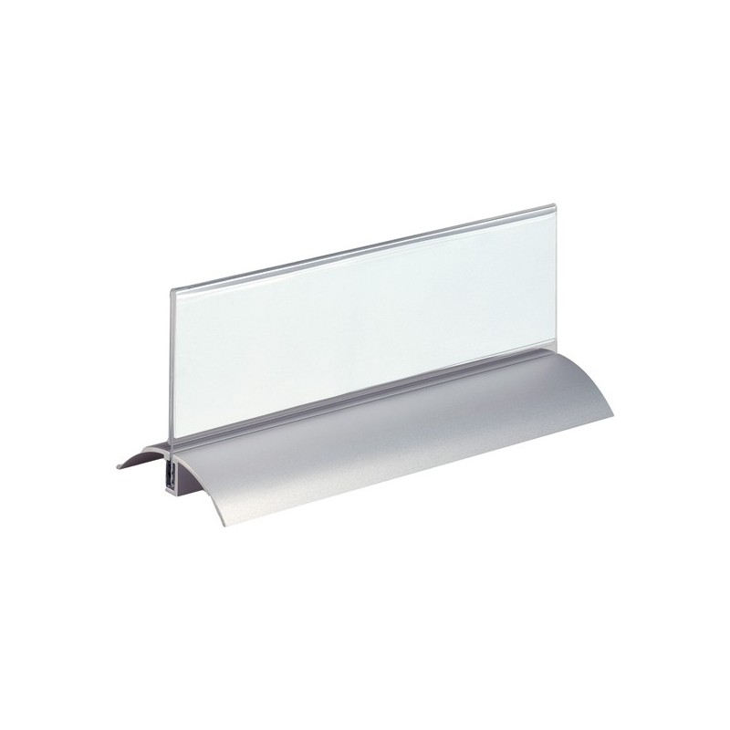 In acrilico trasparente e base in alluminio. Questi portanome da tavolo si adattano a qualunque ambiente grazie alla loro eleganza e design. Dotati di cartoncino inserto bianco stampabile con software duraprint.