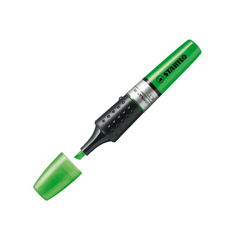 Inchiostro a base d'acqua. Serbatoio a vista XXL con indicatore d'inchiostro. Evidenzia fino a 500mt. Resiste 4 ore senza cappuccio. Due ampiezze di tratto 2-5mm. Colore: verde.