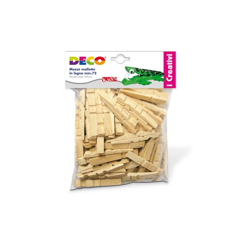 Mezze mollette in legno. Uno dei più tradizionali strumenti didattici per realizzare originali lavori da dipingere. Particolarmente indicati per sviluppare la fantasia del bambino. Sacchetto da 100 pezzi da 72mm.