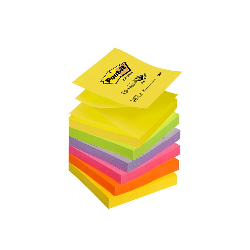 Incollatura a fisarmonica un foglietto tira l'altro. Utilizzabili con uno dei tanti dispenser per foglietti Post-it Z- Notes. Ogni blocchetto contiene 100 foglietti riposizionabili. Formato 76x76 mm. Colori assortiti neon.