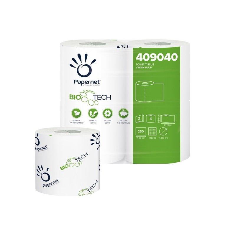IN PURA CELLULOSA 2 VELI MICROGOFFRATA. ROTOLO CLASSICO Ø11CM H9,5CM X 27,5MT. 250 STRAPPI DA 11X9,5CM. PRODOTTA CON L'ESCLUSIVA TECNOLOGIA BATP (BIOLOGIC ACTIVE TISSUE PAPER). Rotoli fascettati singolarmente particolarmente adatti per il settore HO.RE.CA.