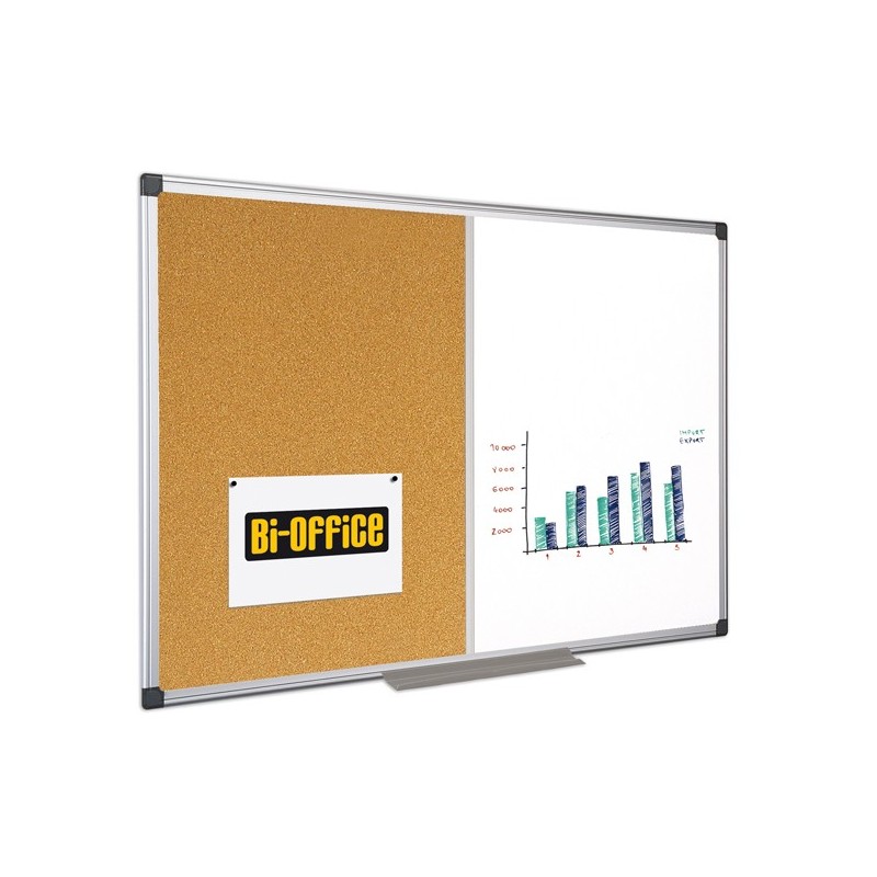 Lavagna metà in sughero e metà in acciaio laccato magnetico cancellabile. Dotato di porta accessori e kit di fissaggio.