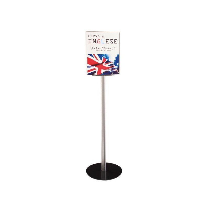 Supporto in alluminio per segnaletica da pavimento, con base in metallo colore grigio canna di fucile e porta avvisi in metacrilato. Dimensioni °32 x 138cm.