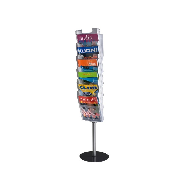 ESPOSITORE DA TERRA CON STRUTTURA IN ALLUMINIO ANODIZZATO E BASE IN ACCIAIO VERNICIATO ANTRACITE. VASCHETTE FORMATO A4 IN MATERIALE PLASTICO FLESSIBILE. FRONTALINO AMOVIBILE PER CONSENTIRE UNA FACILE PULIZIA DELLE VASCHETTE. DIMENSIONI: Ø32 X 130CM - 6 TASCHE A4