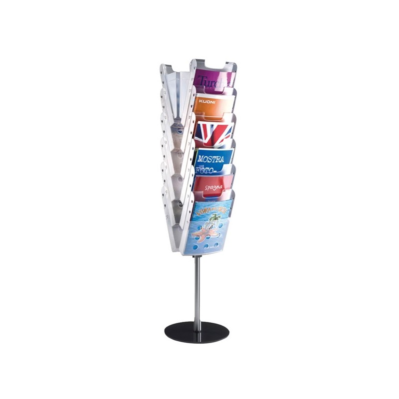 ESPOSITORE DA TERRA CON STRUTTURA IN ALLUMINIO ANODIZZATO E BASE IN ACCIAIO VERNICIATO ANTRACITE. VASCHETTE FORMATO A4 IN MATERIALE PLASTICO FLESSIBILE. FRONTALINO AMOVIBILE PER CONSENTIRE UNA FACILE PULIZIA DELLE VASCHETTE. DIMENSIONI: Ø32 X 130CM - 12 TASCHE A4