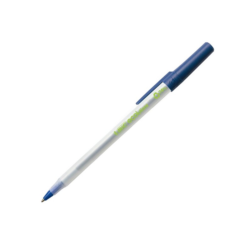 La penna a sfera ECOlutions nella versione con cappuccio, possiede il fusto tondo prodotto con 77% di materiale riciclato. Puntale e cappuccio/clip dello stesso colore dell'inchiostro. Tratto 1,0mm. Colore: blu. Confezione 60 pezzi.