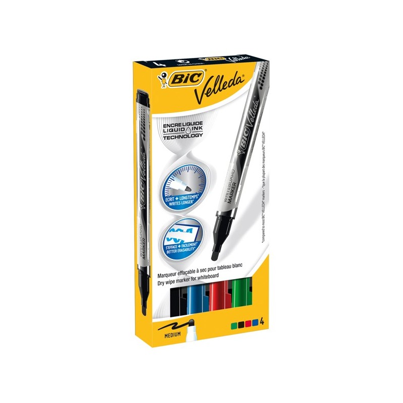 Astuccio 4 colori. Marcatore ad inchiostro liquido a base d'alcool. privo di toluene e xylene. scrittura istantanea e costante. ottima cancellabilità. fusto in plastica traslucida con apposita finestra per il controllo del livello dell'inchiostro. Formato pocket con punta tonda da 2,2mm.