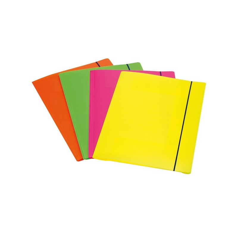 Cartelline Fluo Shocking File realizzate in PPL da 0,6mm in 4 vivaci colori fluo. Riciclabili, indistruttibili e resistenti all'umidità. Cartellina 3L dotata di 3 lembi a cordonatura multipla e chiusura con elastico. Formato 25,5x35,5cm. Dorso 3cm.