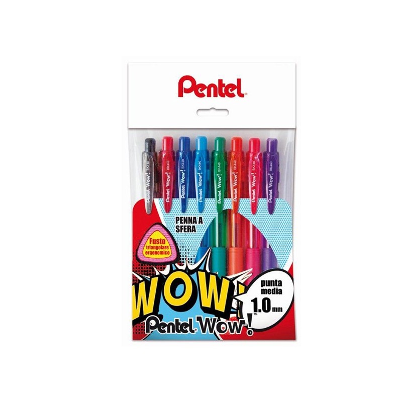 Astuccio da 8 colori. La penna a sfera Pentel WOW! dal design originale è a meccanismo a scatto laterale. Il fusto triangolare ergonomico favorisce l'impugnatura anche grazie al grip in gomma, per un ottimo comfort di scrittura. Asciugatura immediata. Punta 1,0mm.
