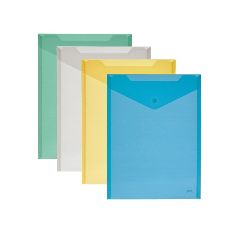 Buste in polipropilene con chiusura a bottone. Confezione assortita in 4 colori. Formato utile: 13,5x18,5cm.